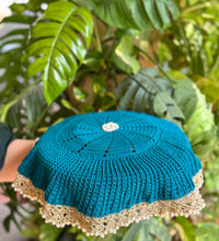 Bring serene elegance to your pooja rituals with this deep blue pearl thal cover, hand-crocheted in fine cotton. The detailed weave lends rich texture, while a subtle metallic border adds a ceremonial glow. Finished with lustrous pearl accents at the ends, it catches the light softly, creating a refined, auspicious presence on your thali. Lightweight and flexible, it drapes smoothly for a polished, handcrafted finish at celebrations and daily worship alike.