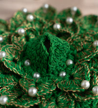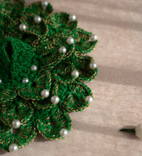 This flower-inspired Gopal Ji dress features layered green petals bordered with elegant pearl accents. The design opens like a bloom, creating a graceful, festive look that highlights the deity beautifully. For 0–1 sized idols.