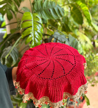 Add a rich, festive touch to your thali with this red crystal thal cover, finely hand-crocheted in soft cotton. The intricate weave brings depth and texture, while a gleaming metallic gold border frames the piece with ceremonial elegance. Finished with radiant red crystal accents at the ends, it sparkles beautifully under light, perfect for poojas, celebrations, and special occasions. Lightweight and flexible, it drapes smoothly over the plate for a refined, handcrafted presentation.